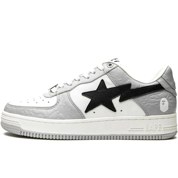 The BAPE STA Low M2 "White/Grey" epitomizes timeless style within the realm of Japanese streetwear. This iconic lifestyle shoe boasts a captivating two-tone colorway that effortlessly blends sophistication with urban charm. With a pristine white leather base and contrasting grey leather overlays adorned with debossed accents, the "White/Grey" exudes understated elegance. The signature "STA" logo from BAPE takes center stage in black suede on both sides, while an embroidered BAPE logo on the lateral heel adds a touch of authenticity. Classic "BAPE STA" detailing graces the heel and tongue tag, maintaining the brand's legacy. A distinctive BAPE lace accessory on the vamp adds a personalized touch to this urban classic. All of this sits atop a white rubber midsole for comfort and is grounded by a grey outsole, making the BAPE STA Low M2 "White/Grey" a symbol of enduring style and a must-have in streetwear fashion.