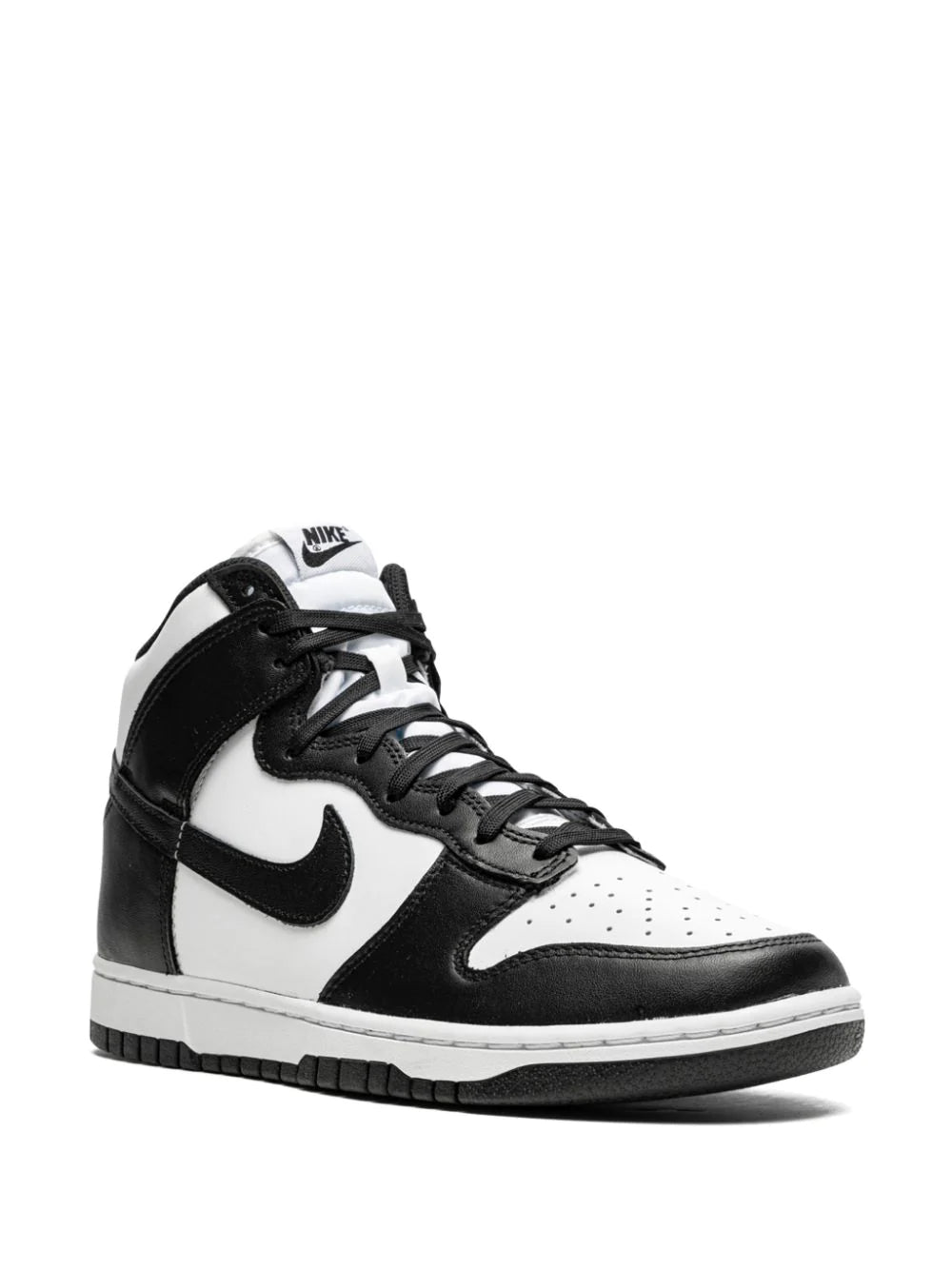 The Nike Dunk Retro, a basketball silhouette, is showcased in a supportive high-top design with contrasting white and black tones, resulting in an effortlessly eye-catching look for this pair.